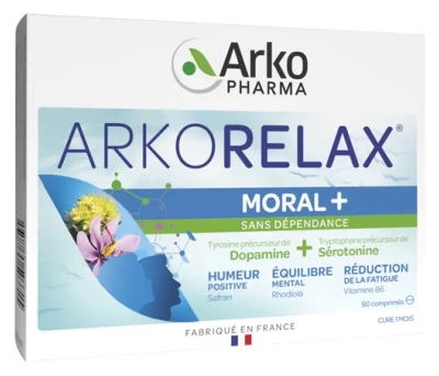 Arkopharma Arkorelax Moral+ 60 Tablets is a food supplement which associates plants and precursor amino acids of Dopamine and Serotonin, often called “happiness molecules”.