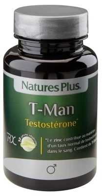 Natures Plus T-Man Testosterone 30 Vegetable Capsules is a dietary supplement containing zinc that helps to maintain normal blood testosterone levels.
