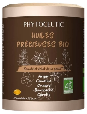 Phytoceutic Precious Oils Organic 105 Capsules is a nutritional supplement for the beauty and radiance of the skin. Its formula combines 4 oils (argan, camelin, evening primrose and borage) containing essential fatty acids of the omega 3 and 6 family, complemented by an oily carrot macerate for the radiance of the complexion.