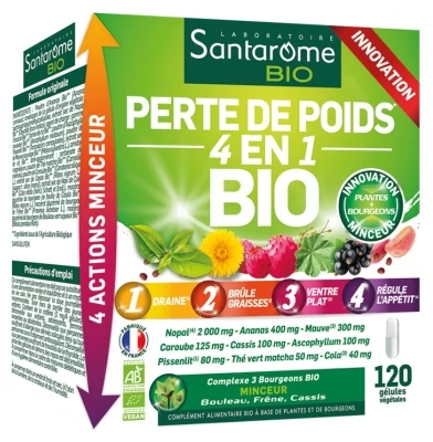 Santarome Bio Weight Loss 4in1 Organic 120 Capsules is a dietary supplement that drains, burns fat, contributes to a flat stomach and regulates appetite.